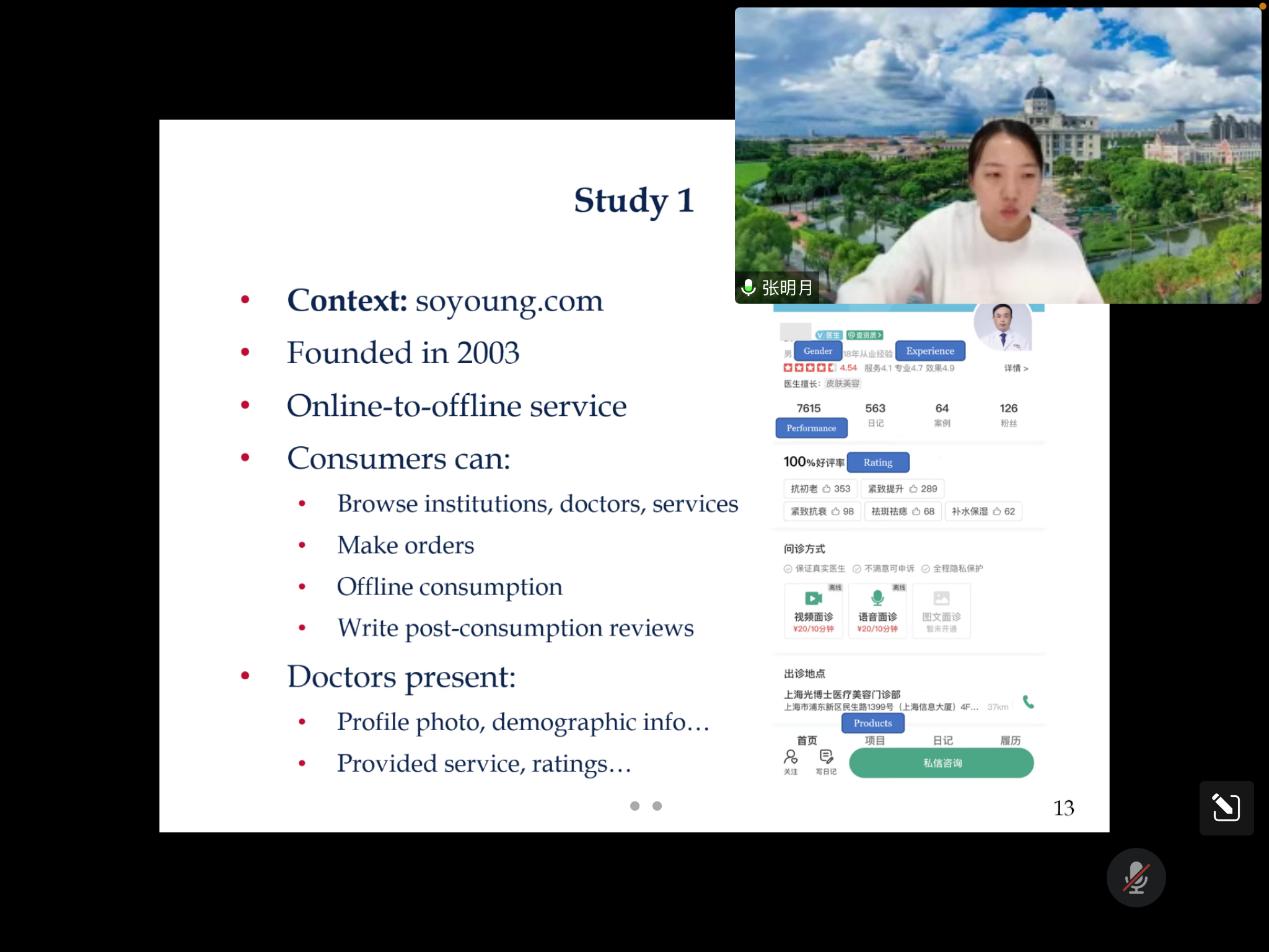 解决问题的部分,张副教授提出从以下三个方面来研究问题:OTO美容服务平台上,医生照片中显示的美貌是否会影响消费者的决策?该影响取决于医生的性别和以前消费者的评分吗?产生这种现象的原因是出于专业服务的性质,还是追求美的消费者的自我选择?为解决上述问题,张副教授具体介绍了相关的两个实验研究。实验一通过收集美容服务平台(SoYound.com)和专业医疗平台(Haodf.com)的数据,进行负二项回归分析。实验二则设计了一个随机实验来进一步排除消费者的自我选择问题。