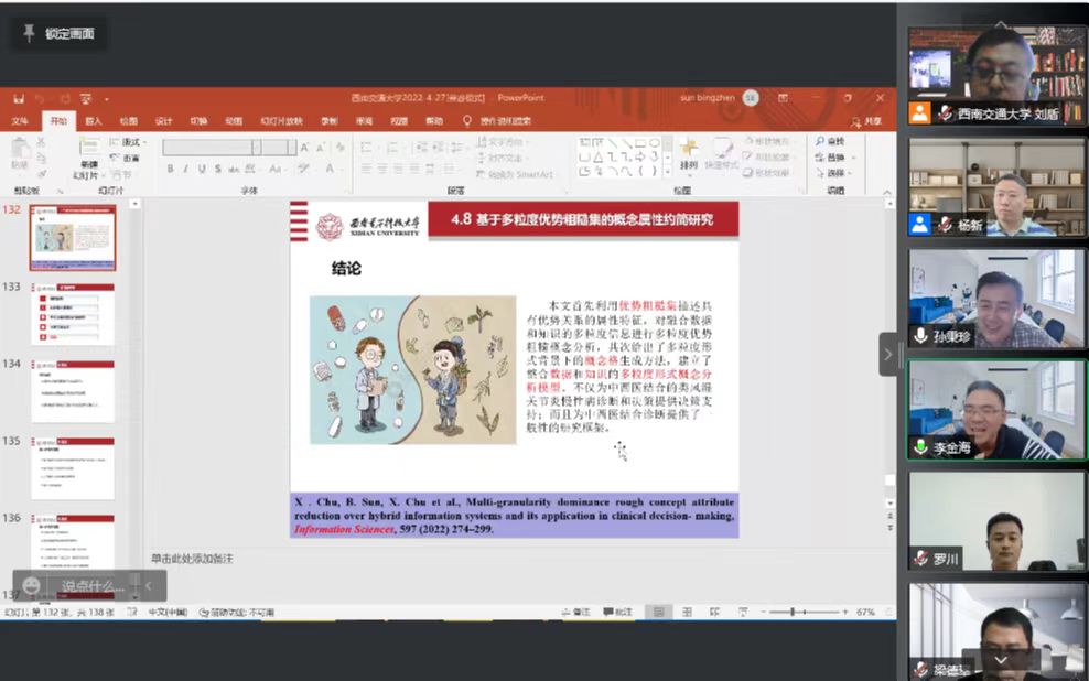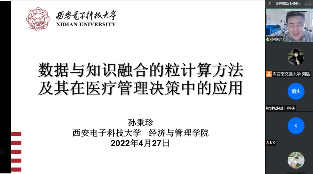 2022年4月27日下午2点,西安电子科技大学孙秉珍教授和昆明理工大学李金海教授应邀在腾讯会议上分别开展了题为“数据与知识融合的粒计算方法及其在医疗管理决策中的应用”、“网络概念知识发现”的线上学术报告。冰球突破豪华版官方网站信息系统与运营管理系刘盾教授主持了此次讲座,校内外师生100余人参加了此次学术交流。