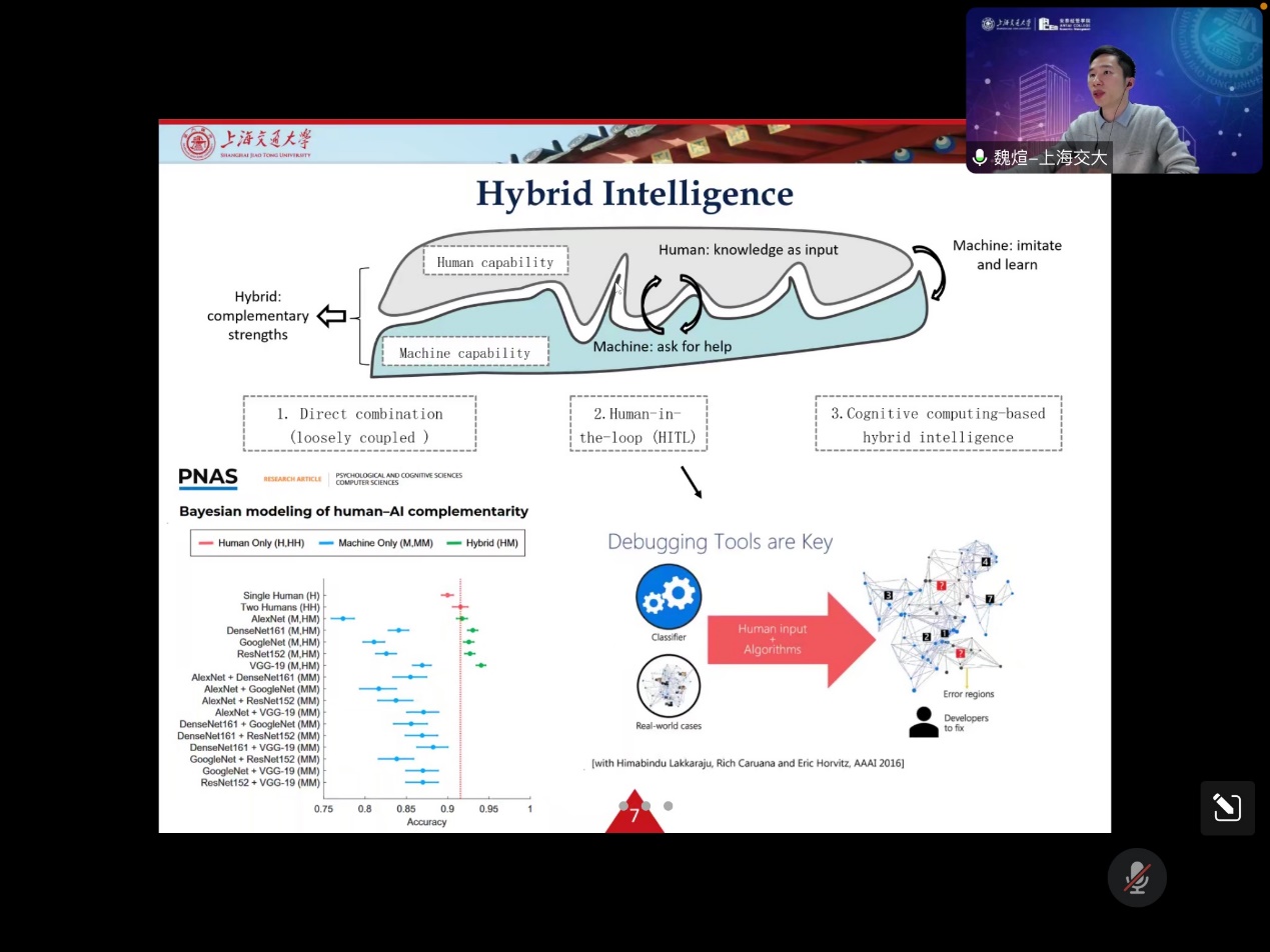 首先,刘盾教授对魏煊助理教授致以诚挚的感谢和欢迎,并向师生介绍了魏煊助理教授的研究方向和学术成就。魏煊助理教授就职于上海交通大学安泰经济与管理学院,博士毕业于美国亚利桑那大学Eller商学院,主要研究领域为人工智能、混合智慧与人智交互、群体智慧、社交媒体分析等。入选两项省部级人才计划,主持国家自然科学基金青年项目1项和上海市课题1项。参与国家自然科学基金创新研究群体1项、重大项目1项、重点项目1项、面上项目4项,青年基金1项。发表了包括UTD 24列表的MIS Quarterly, INFORMS Journal on Computing在内的8篇论文,曾在INFORMS等多个国际会议上获得最佳论文奖。