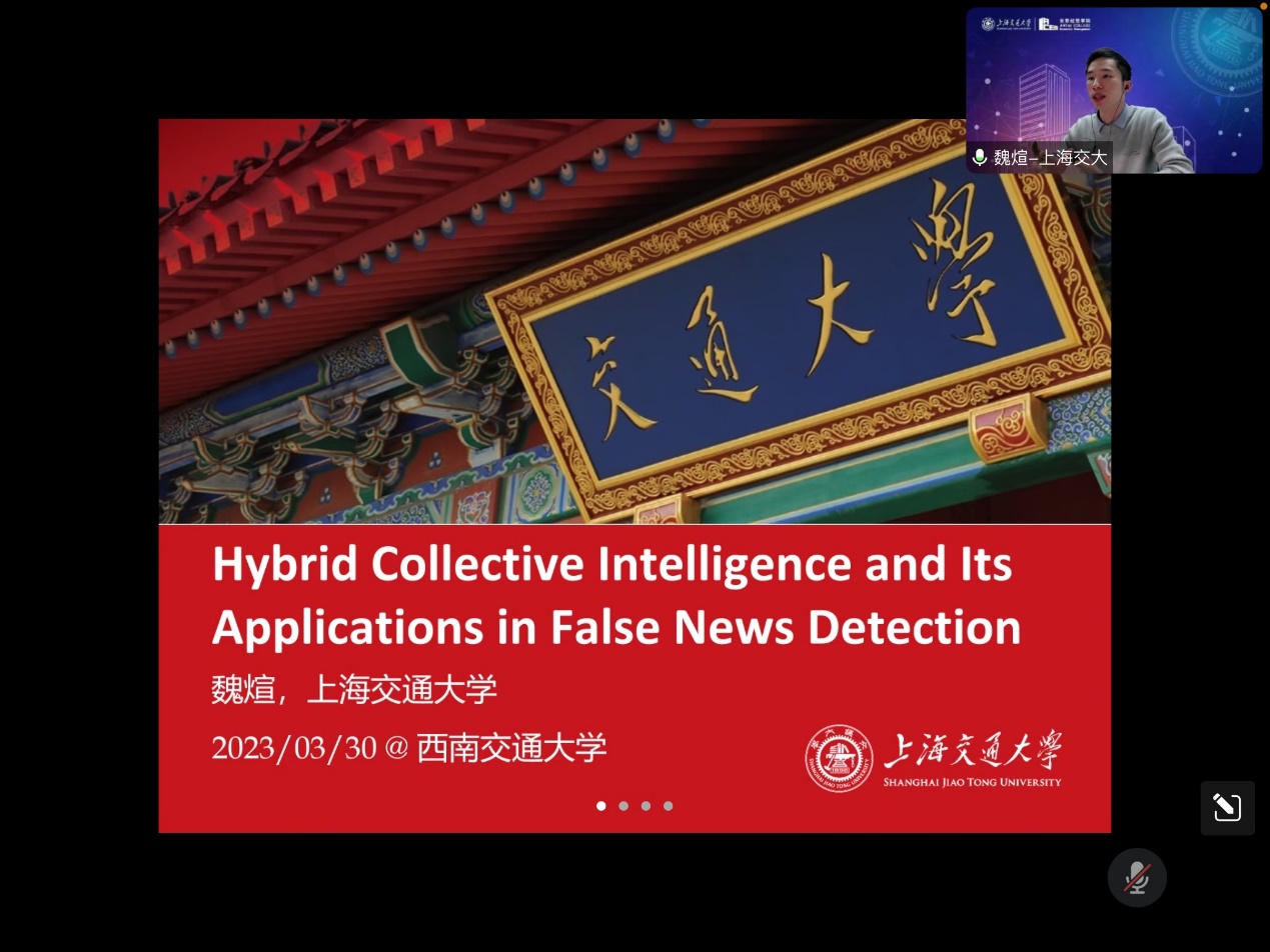 3月30日下午14点30分,上海交通大学安泰经济与管理学院魏煊助理教授应邀为冰球官网师生带来了题为“Hybrid Collective Intelligence and its Applications in False News Detection”的学术讲座。讲座由冰球官网信息系统与运营管理系刘盾教授刘盾教授主持,学院部分教师及研究生参与了此次学术活动。