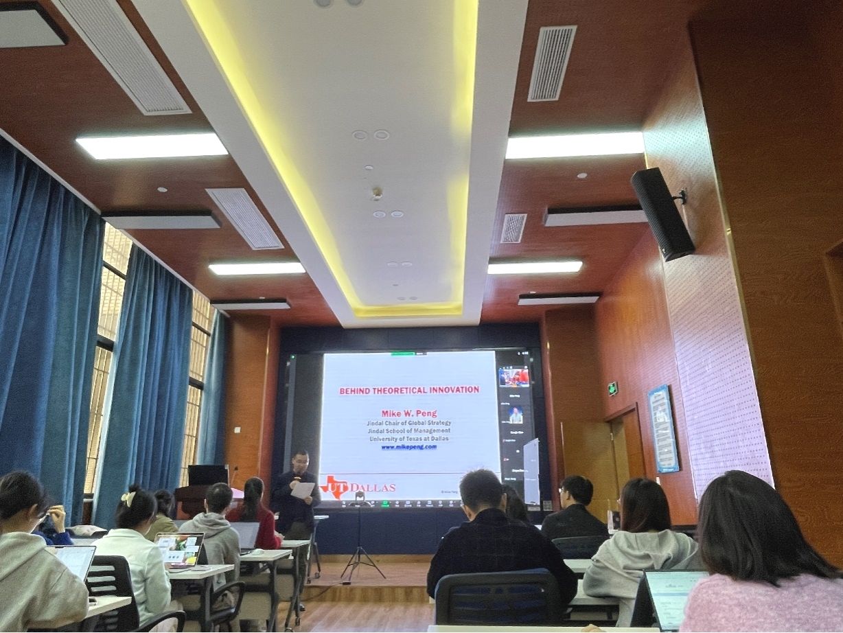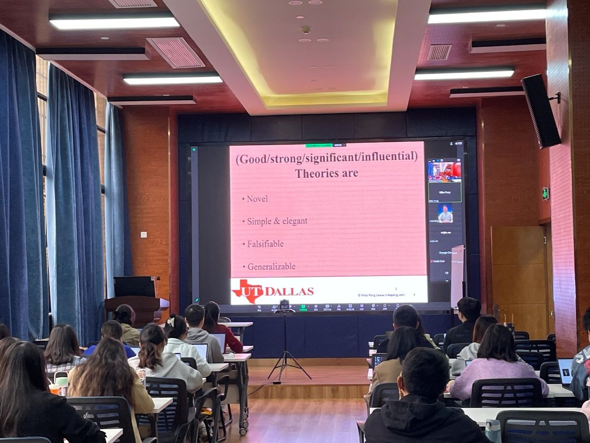 2023年10月18日上午,达拉斯德州大学(University of Texas at Dallas)的Mike Peng教授应邀在线上为冰球官网师生作了一场题为“Behind theoretical innovation”的学术讲座。讲座由学院市场学系黄缘缘副教授主持,学院部分老师和学生参与了此次学术活动。