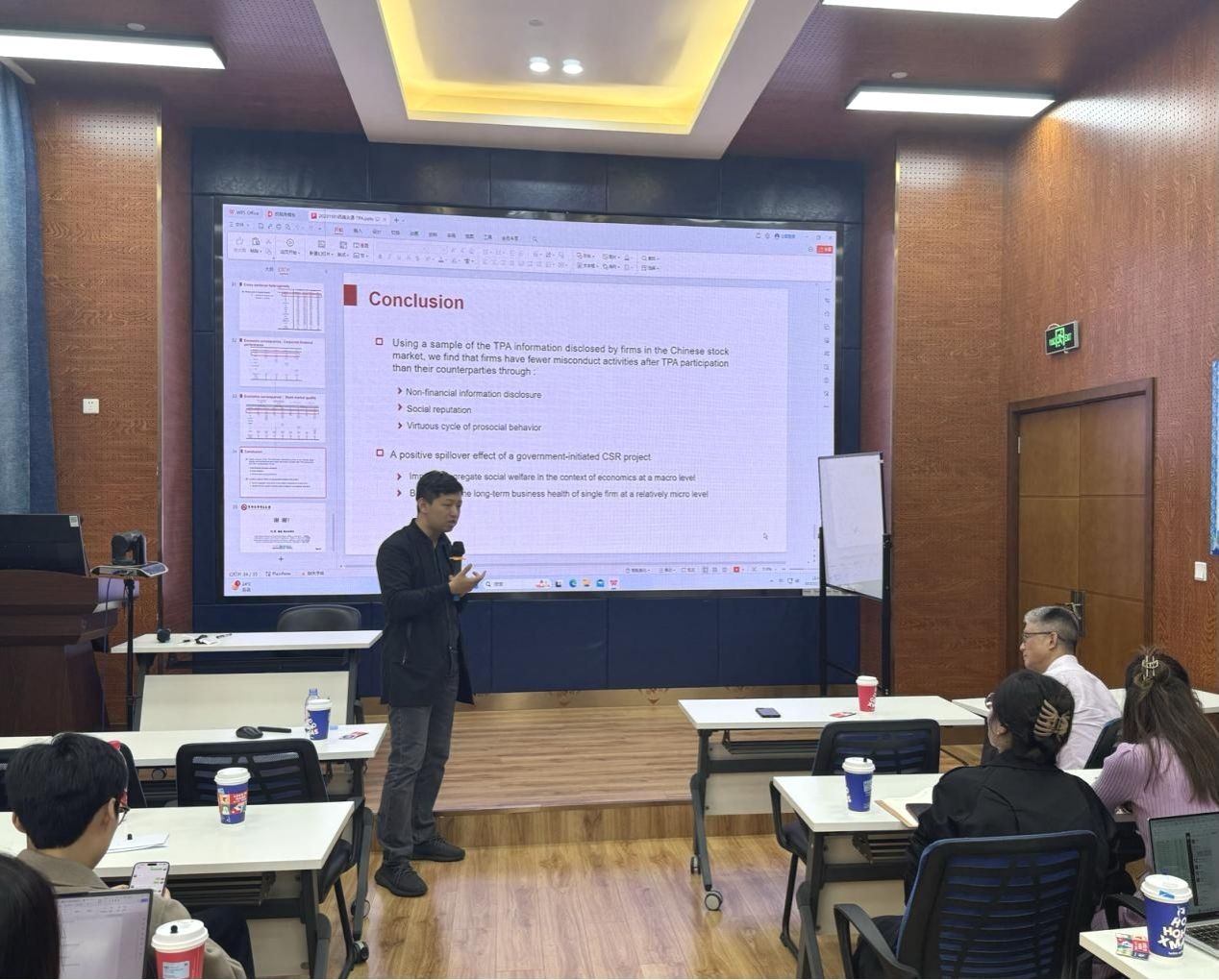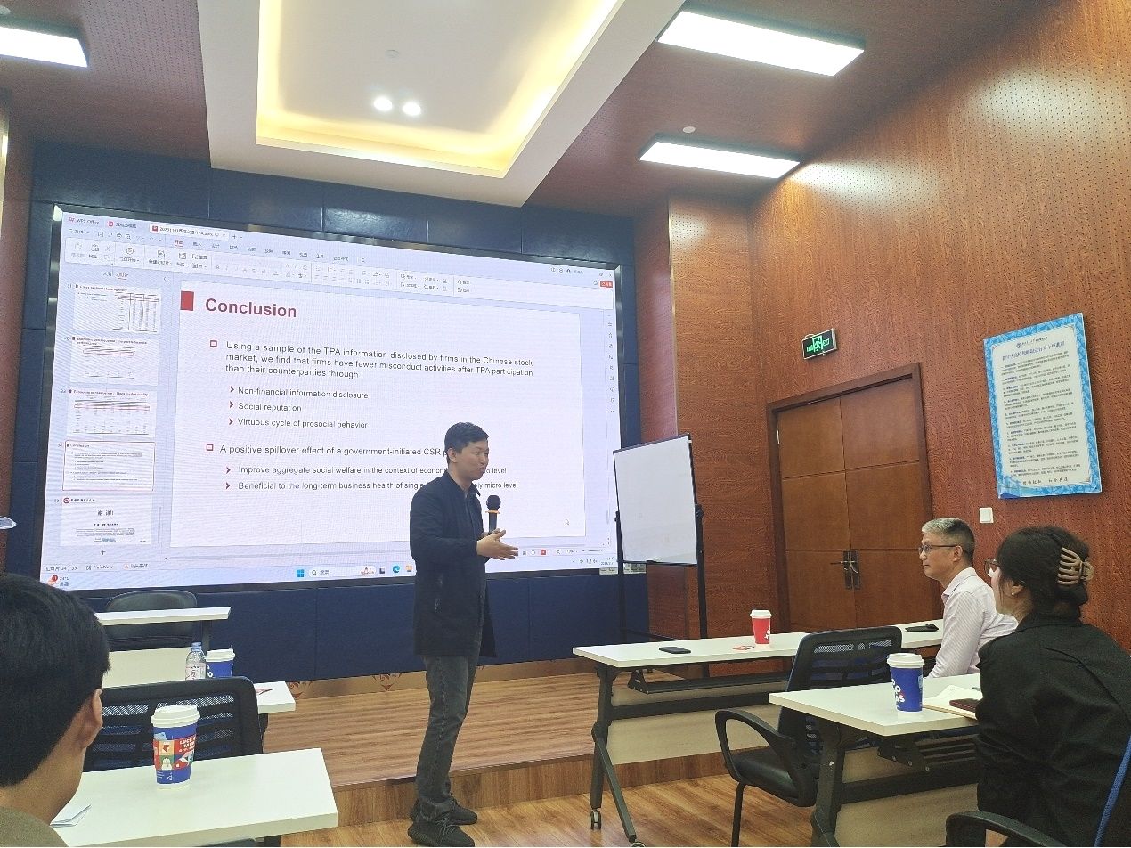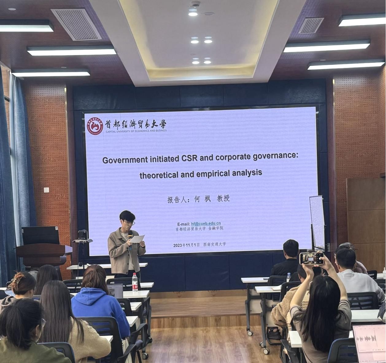 2023年11月1日下午15:00,首都经济贸易大学金融学院何枫教授应邀在九里校区0218室为冰球官网师生作了一场题为“Government initiated CSR and corporate governance: theoretical and empirical analysis”的讲座。此次学术活动由学院金融与财务学系马锋副教授主持,学院部分教师以及研究生参加此次活动,马锋副教授对何枫教授的学术成果进行了介绍,同时对何教授的到来表示热烈的欢迎和感谢。
