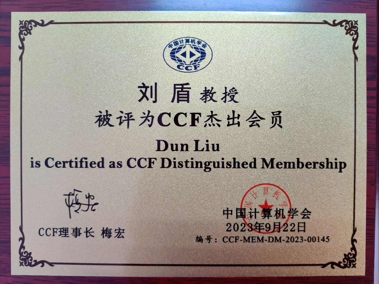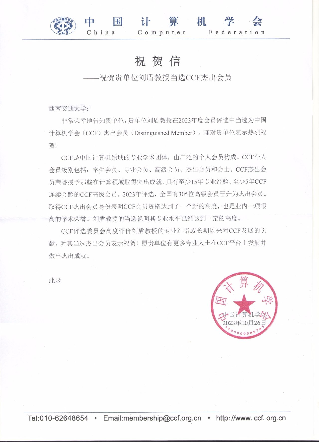 在CCF给刘盾老师发来的贺信中,高度评价了刘盾老师的专业造诣和长期以来对CCF的贡献,同时对他的当选表示热烈祝贺。取得CCF杰出会员身份表明CCF会员资格达到了一个新的里程碑,其评选比例不超过专业会员数的10%,是CCF平台的一种认可,也是行业内一项很高的学术荣誉。