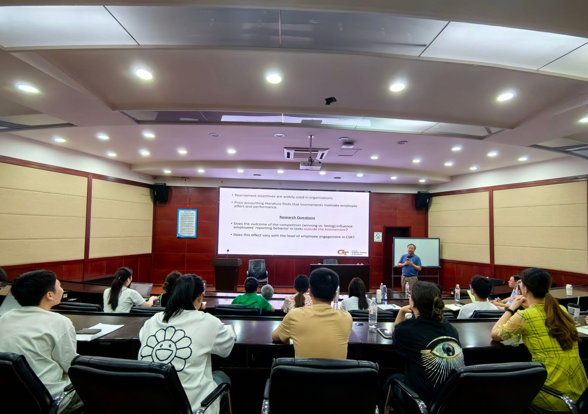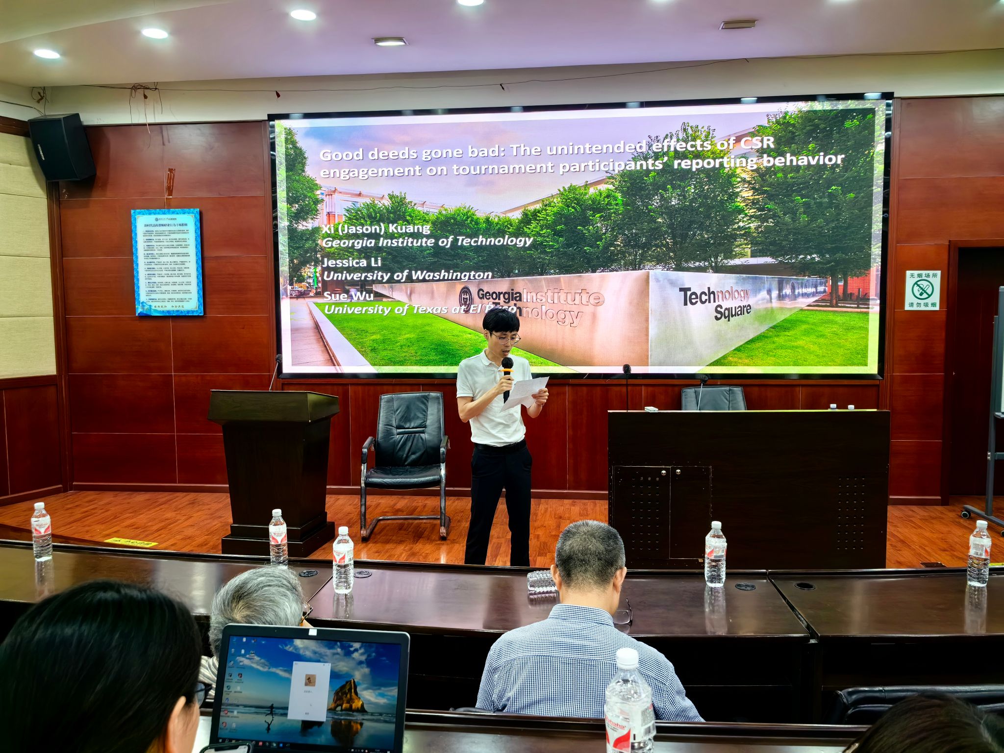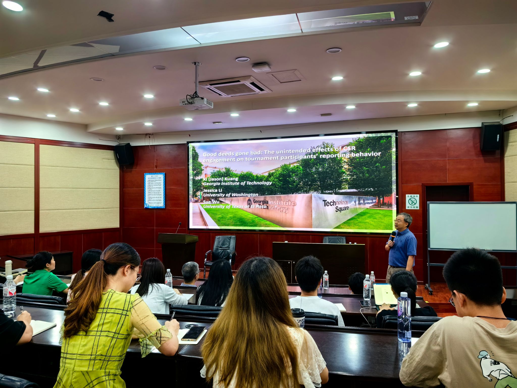 2024年6月28日下午,美国佐治亚理工学院况熙教授应邀在冰球突破豪华版官方网站开展题为“Good deeds gone bad: The unintended effects of CSR engagement on tournament participants’ reporting behavior”的学术报告,副院长马锋主持了此次学术讲座,学院部分教师及研究生参加了此次活动。副院长马锋介绍了况熙教授的学术背景及研究成果,并对况熙教授的到来表示热烈的欢迎和诚挚的感谢。