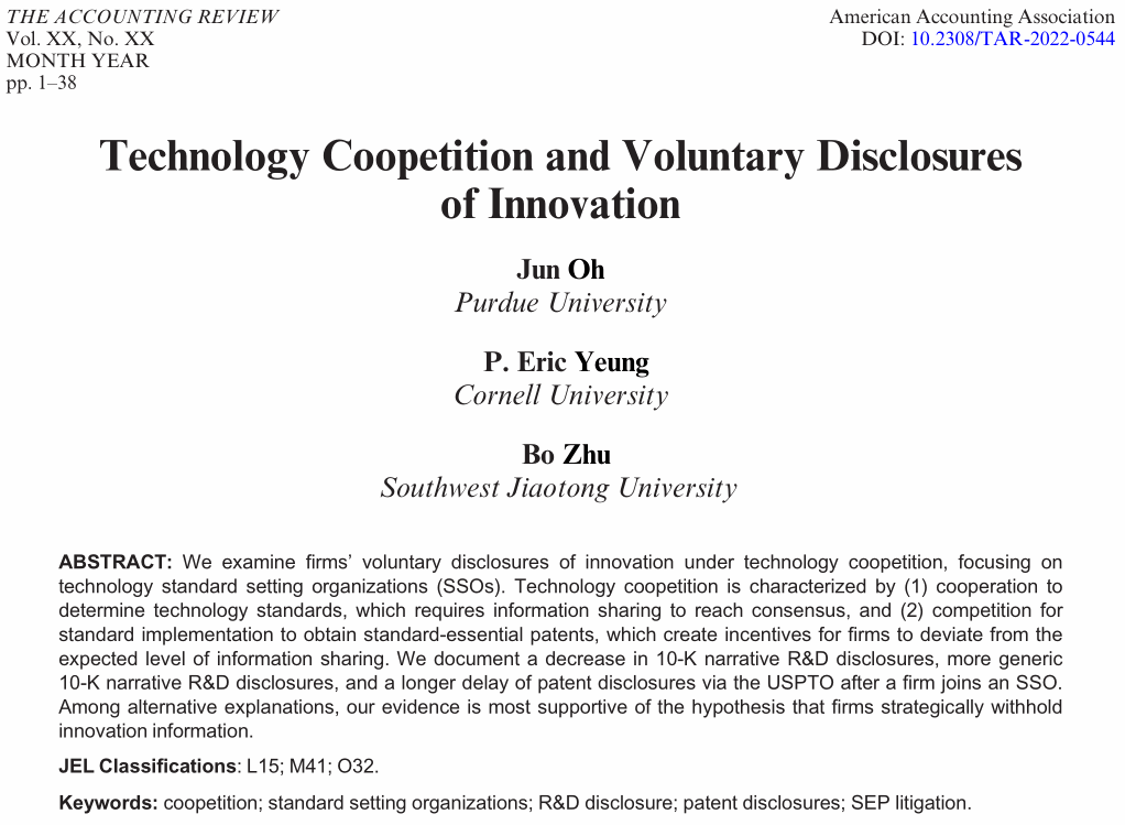 冰球突破豪华版官方网站会计学系副教授诸波于2024年8月在UTD 24期刊The Accounting Review在线公开发表题为Technology Coopetition and Voluntary Disclosures of Innovation的论文。该论文以技术标准制定机构(SSO)为研究对象,考察了企业在技术竞合下创新的资源披露情况。技术竞合的特点是:(1)合作制定技术标准,这要求企业信息共享以达成共识;(2)竞争标准执行以获得标准必要专利,这会激励企业偏离预期的信息共享水平。研究发现,在企业加入SSO后,减少了10-K文件中的叙事性研发披露、10-K文件中披露更通用的叙事性研发信息,更长地延迟通过美国专利商标局进行专利披露。论文的实证证据支持企业策略性地隐瞒创新信息披露的假设。