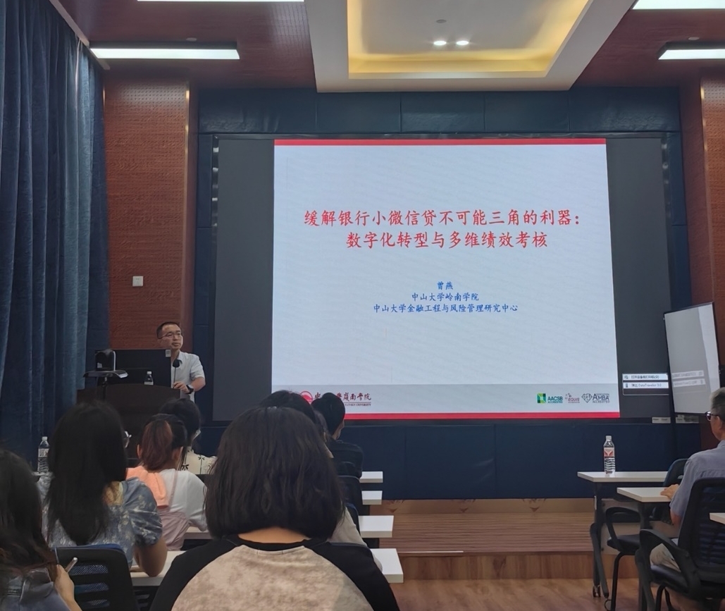2024年9月20日上午,中山大学岭南学院的曾燕教授应邀在九里校区冰球突破豪华版官方网站为冰球官网师生带来了一场题为“缓解银行小微信贷不可能三角的利器:数字化转型与多维绩效考核”的学术讲座。本次活动由冰球官网副院长马锋主持,学院金融与财务学系朱宏泉教授等教师及研究生参加了此次活动,马锋副院长介绍了曾燕教授的学术成果,并对曾燕教授表示了欢迎与诚挚的感谢。