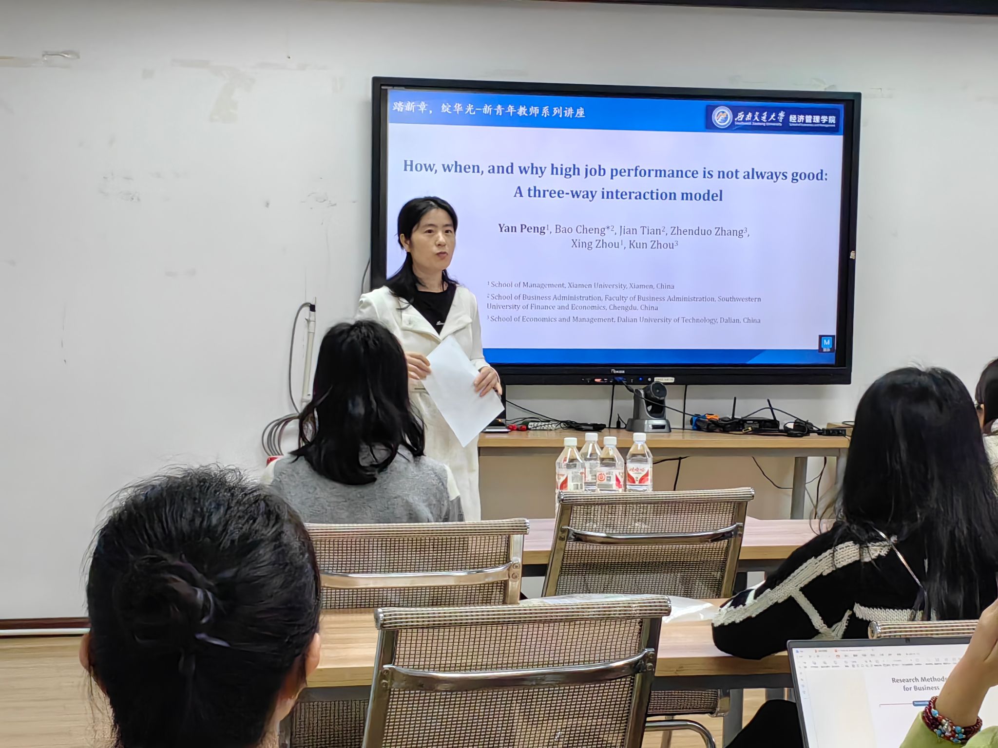 2024年11月1日,冰球突破豪华版官方网站九里校区零号楼0411室成功举办了新青年教师系列讲座。本次讲座邀请冰球突破豪华版官方网站创新创业与管理学系助理教授彭艳博士主讲,主题为“How, when, and why high job performance is not always good: A three-way interaction model”讲座吸引了学院众多硕博研究生及对组织行为学有浓厚兴趣的老师参与,由冰球突破豪华版官方网站市场学系副主任范春梅副教授主持。