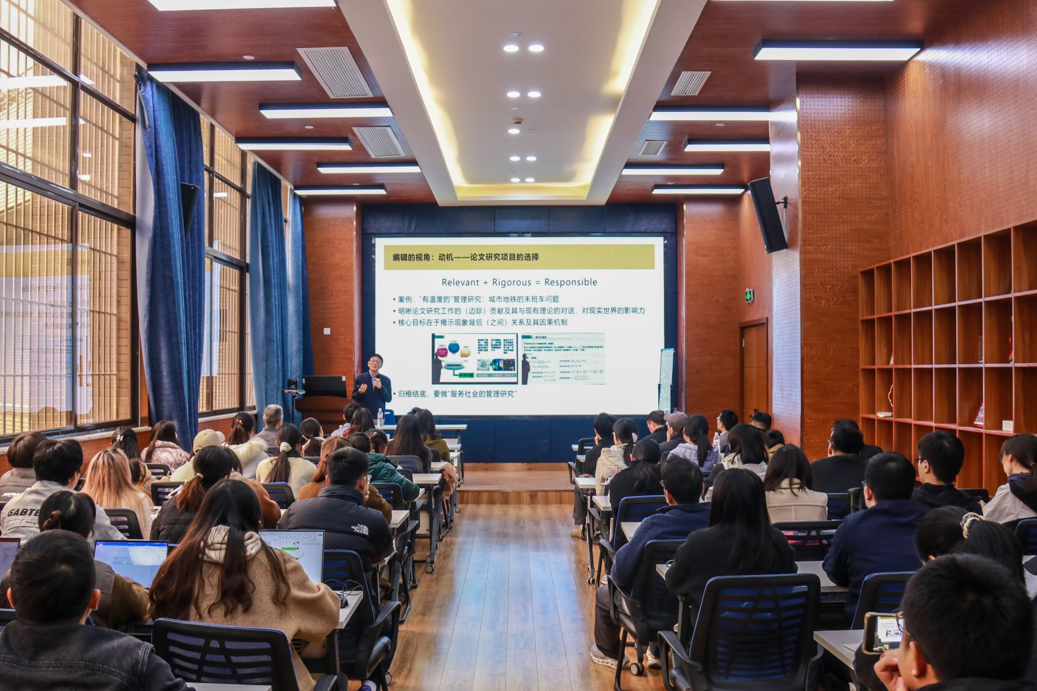 张维教授从学术生态系统的视角,围绕研究中的动机、行动和呈现三个方面,与师生们进行了深入分享。首先,在“动机”方面,张教授结合其担任期刊编辑的丰富经验,从项目选择、“本土化”与“普遍性”、“热点”以及期刊的“选题”多个层面展开论述,为师生们揭示了学术研究中的核心驱动力。接着,在“行动”方面,张维教授重点强调了论文研究的严谨性与规范性,以及如何讲好中国故事,增强研究的学术价值。最后,在“呈现”方面,张教授以论文题目、摘要、引言和文献综述为切入点,逐一讲解了论文写作的关键环节。张教授通过多个实际案例,生动阐释了如何用简练的学术语言,讲述一个有趣且富有意义的学术故事。他指出,一篇优秀的学术论文本质上就是用科学的语言讲好一个故事。