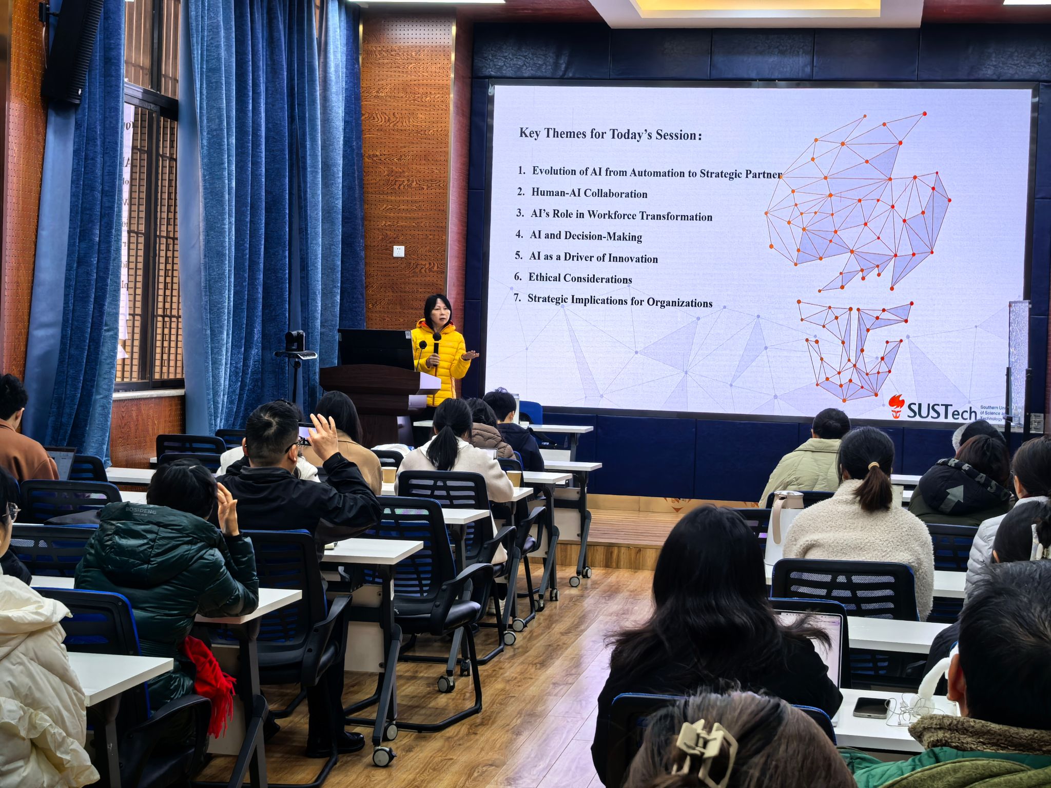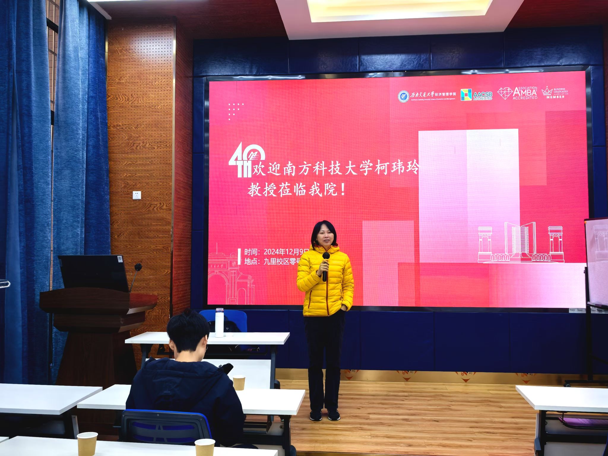 2024年12月9日上午,南方科技大学柯玮玲教授应邀为冰球官网师生带来题为“超越自动化:人工智能在塑造未来组织中的战略角色”的学术讲座。学院副院长马锋、部分教师以及研究生30余人参加了本次学术交流活动。副院长马锋在场学院师生介绍了柯玮玲教授的学术背景与成就,并对柯玮玲教授表示热烈的欢迎与诚挚的感谢。