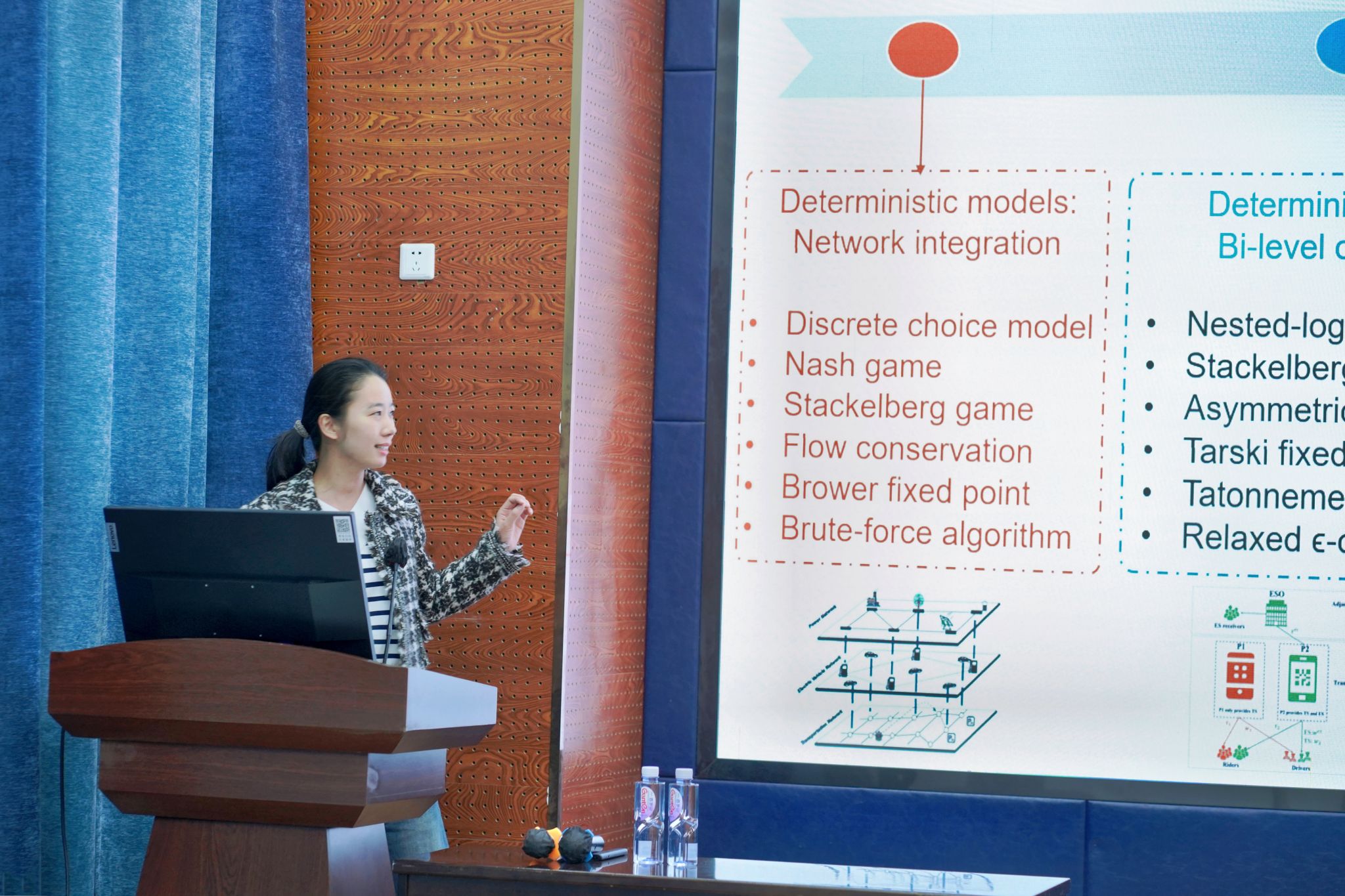 随后,丁琰妍博士聚焦确定性模型下能源系统与交通系统的相互作用,分析了在两个系统中DNO和SEV平台运营商的战略互动,详细讲述了本文提出的Stackelberg 和Nash两种不同的市场竞争模型,通过分析证明得出交通系统中旅客与驾驶员之间的供需平衡始终存在,利用数值算例验证了SEV和DNO两个平台运营商之间存在稳定且唯一的均衡解,同时,根据运输服务的需求水平,整合放电服务也将对耦合的交通网络产生不同的影响。