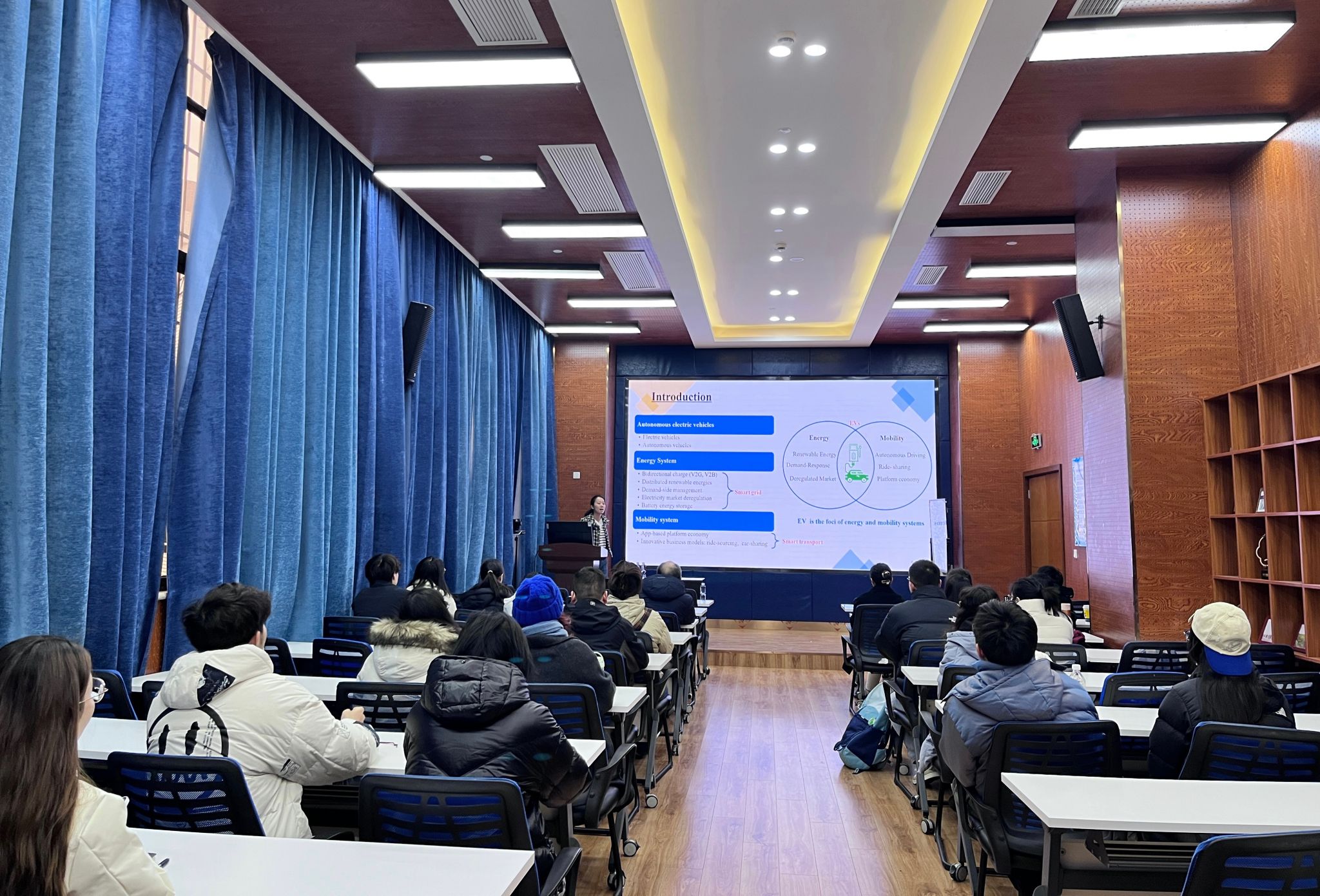 首先,副院长马锋对丁琰妍博士的学术成果进行了介绍,并对她的到来表示热烈欢迎。丁琰妍博士对本次研究的背景和思路作出了详细的介绍,她针对能源与交通耦合系统中的网络优化与平台定价策略进行深入研究,探讨了能源系统与交通系统互相作用下的四种不同情形。