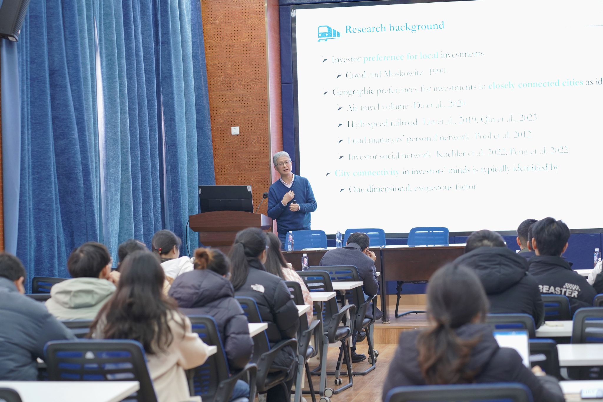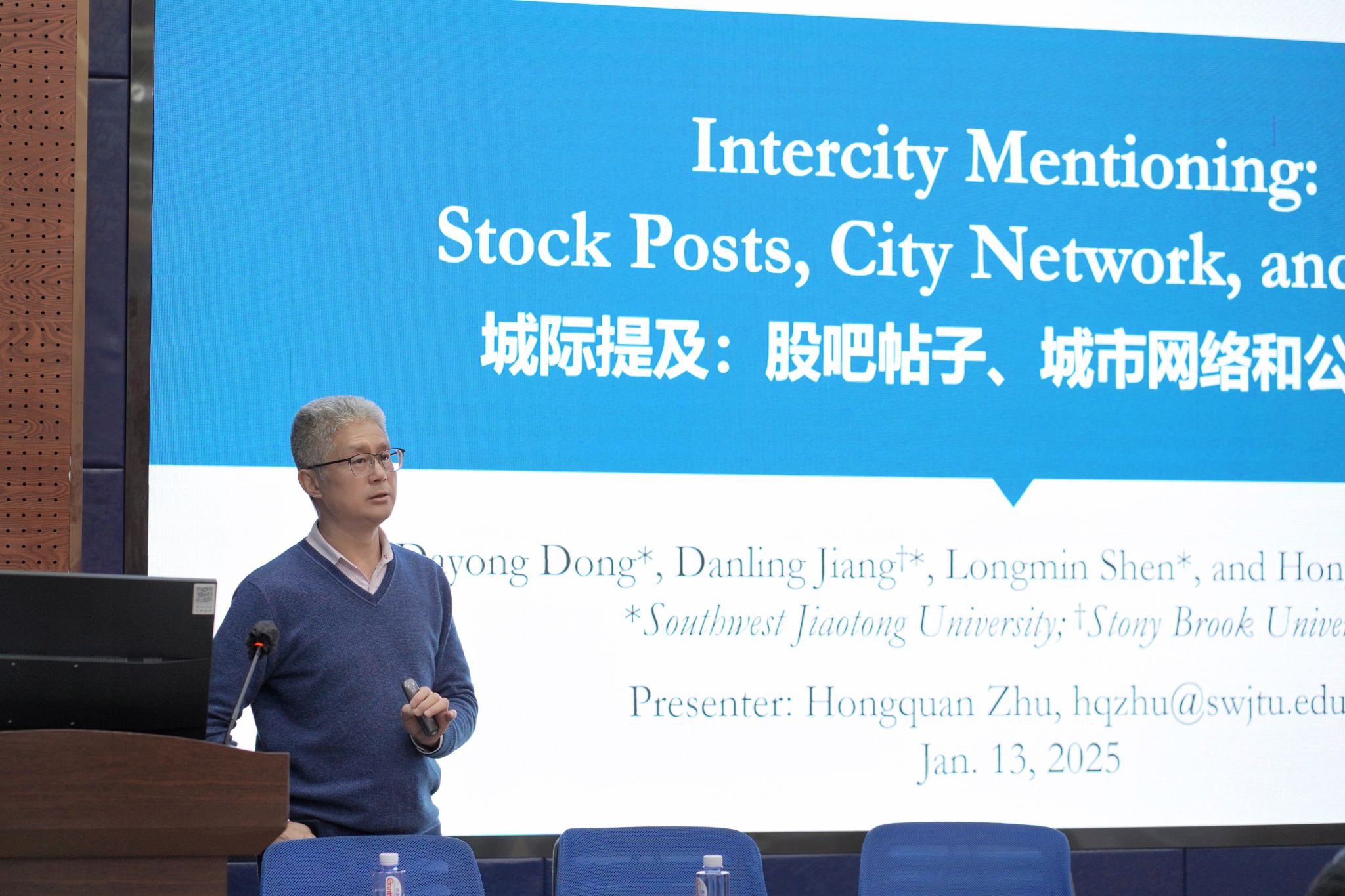 2025年1月13日,在冰球突破豪华版官方网站九里校区冰球突破豪华版官方网站举办了师道永传,匠心筑梦——资深教师系列讲座,本次讲座特邀学院的朱宏泉教授作为主讲嘉宾,围绕“Intercity Mentioning: Stock Posts, City Network, and Firms(城际提及:股市帖子、城市网络与企业)”这一主题展开。本次学术活动由金融与财务学系主任董大勇教授主持,董大勇教授向与会者介绍了朱宏泉教授的学术背景及其在该领域的贡献,并对朱教授的分享表达了诚挚地感谢。