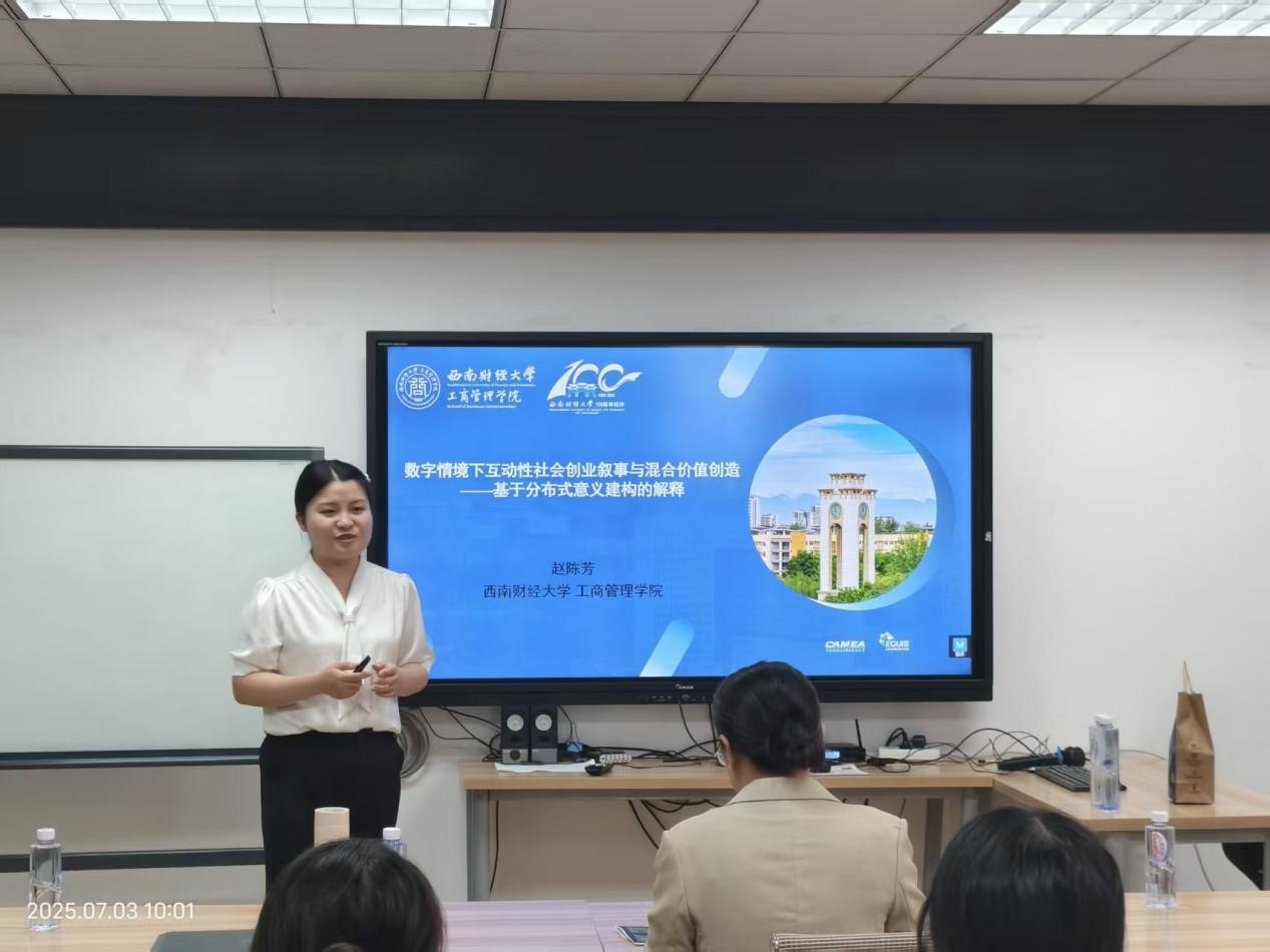 2025年7月3日上午于九里校区零号楼0411教室,冰球官网特邀西南财经大学工商管理学院赵陈芳助理教授进行题为《数字创业叙事对社会创业绩效的影响研究——基于意义建构视角》的讲座。本次讲座由冰球官网创新创业与管理学系副教授刘玉焕主持,吸引了学院部分师生现场聆听与交流。