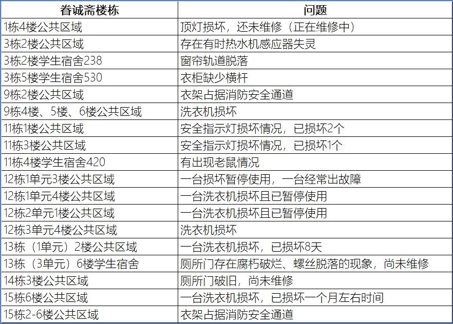 宿舍楼出现公共区域物品损坏时,几乎都能得到良好的解决。但目前九里校区眷诚斋1-15栋学生宿舍楼仍然存在许多亟需解决的问题。其中,最多的就是洗衣机的损坏问题。由于每层楼几乎只配备一台洗衣机,洗衣机的损坏会切实地影响到同学们的日常生活,尤其是在寒冷的冬天。另外,消防通道占用、门灯损坏等问题也需尽快解决。