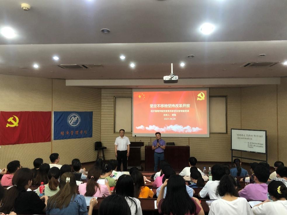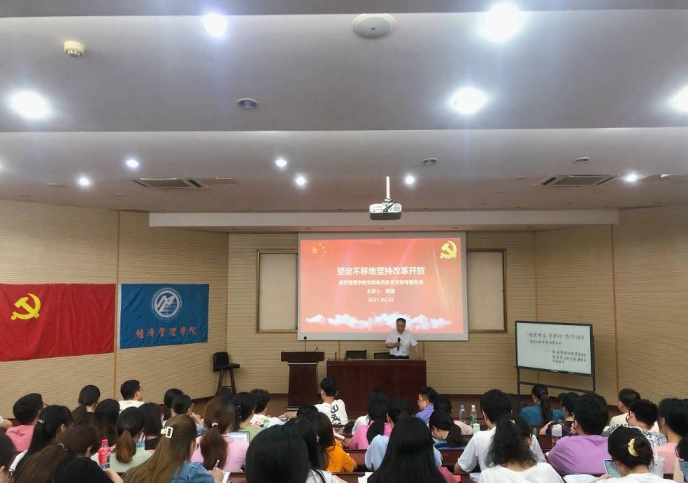 2021年6月28日晚,在0202教室,冰球突破豪华版官方网站执行院长郭强同志以“坚定不移地坚持改革开放”为主题,讲授了庆祝建党百年专题微党课。参加本次党课的有学院本科经贸类党支部成员、2018级博士党支部和工程管理系教工支部成员。