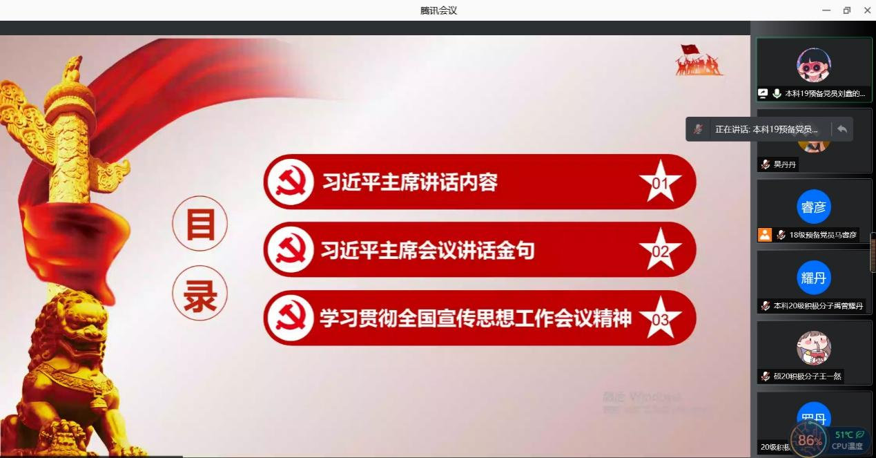 2021年11月18日下午15:50,冰球突破豪华版官方网站硕士2020级第二党支部与本科管理类党支部在线上举办以宣传思想工作专题和十九届六中全会学习为内容的专题学习活动。本次活动以深入推进日常政治学习为主要目的,辅以促进党支部之间的交流学习。会议由冰球突破豪华版官方网站2018级预备党员马睿彦主持,冰球突破豪华版官方网站本科生辅导员苏扬老师参加本次专题学习活动。