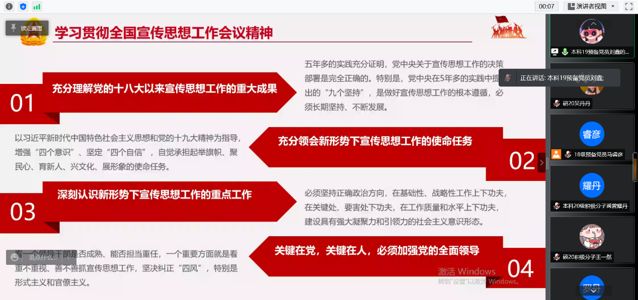 最后,苏扬老师对两支部的联合学习表示肯定,并希望大家在初步学习专题内容后,能够进一步深入学习,学深悟透、融会贯通。