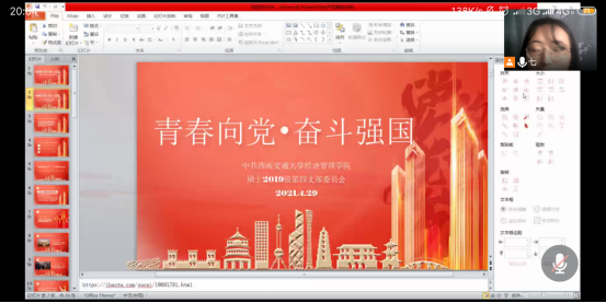 2021年4月29日晚八点,冰球突破豪华版官方网站硕士2019级第四党支部依托腾讯会议平台开展了线上党组织生活会。本次会议以“青春向党·奋斗强国”为主题,由邹嘉瑞同志主持,旨在带领大家回顾与学习中国共产党的光辉历程,调动全体党员学习党史的积极性。