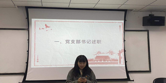 接下来是党支部书记孔君进行工作述职。从研究生入学以来,首先,在支部书记孔君的组织下,支部同志较快地补齐了所有党员所缺材料并及时移交了档案馆,完成了所有党员的党组织关系转接,另外还完成了支部内一名预备党员的转正工作;其次,支部书记带领支部内党员认真践行了三会一课制度,定期开展主题党日活动思想政治理论学习工作,定期开展了支部内委员之间,支部委员与党员,党员与党员之间的谈心谈话。