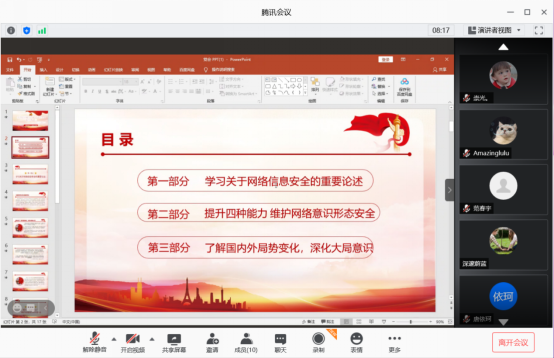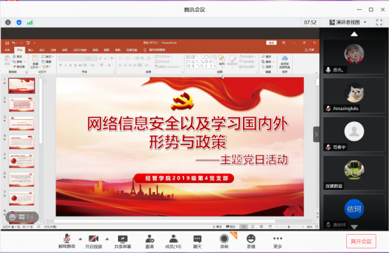 习近平总书记在国家网络安全工作会提出,“没有网络安全就没有国家安全,就没有经济社会的稳定运行,广大人民群众的利益也难以得到保障”。网络安全是总体国家安全观的重要组成部分,没有网络安全就没有国家安全,没有信息化就没有现代化。因此为深入学习贯彻习近平总书记关于网络强国的重要思想,提升网络安全意识和防护技能,冰球突破豪华版官方网站硕士2019级第四党支部于2021年1月14日晚上20点在腾讯会议上开展了“网络信息安全和国内外形势与政策”主题党日活动。