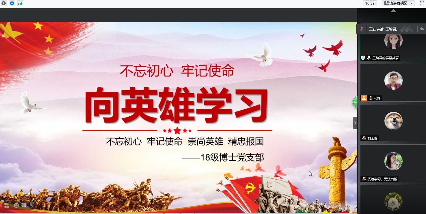 2021年4月1日晚八点,冰球突破豪华版官方网站2018级博士党支部,在腾讯线上会议室,召开了“不忘初心,牢记使命,向英雄学习”文件精神领会微党课暨组织生活会。会议由2018级博士党支部书记和杉同志和支部党员王琦君同志主持,通过“微党课”的形式带领大家一起深入领会了《不忘初心,牢记使命,向英雄学习》的主要精神。通过学习革命英雄事迹和习近平总书记崇尚英雄、缅怀先烈的讲话,感悟习近平的习近平总书记的英雄情怀。