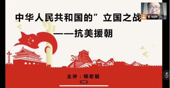 2020年12月11日晚八点,为纪念中国人民志愿军抗美援朝出国作战70周年,学院党委副书记杨宏毅老师组织了一场多支部参与的抗美援朝主题党课活动,带领全体党员重温历史,领悟革命精神。冰球突破豪华版官方网站本科经贸类党支部、硕士2018级第三党支部、硕士2019级第四、五党支部、硕士2020级第一、三党支部、博士2020级党支部均全程在线。杨老师分别从抗美援朝战争的基本情况、志愿军司令人选的确定、上甘岭战役的数据等方面向我们讲述了抗美援朝战争中的细节,全程持续100分钟。