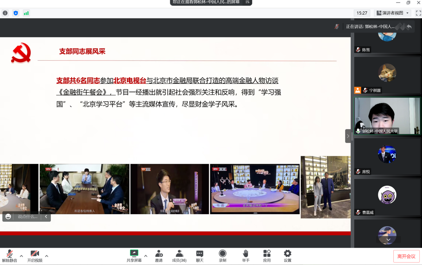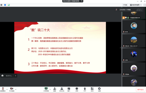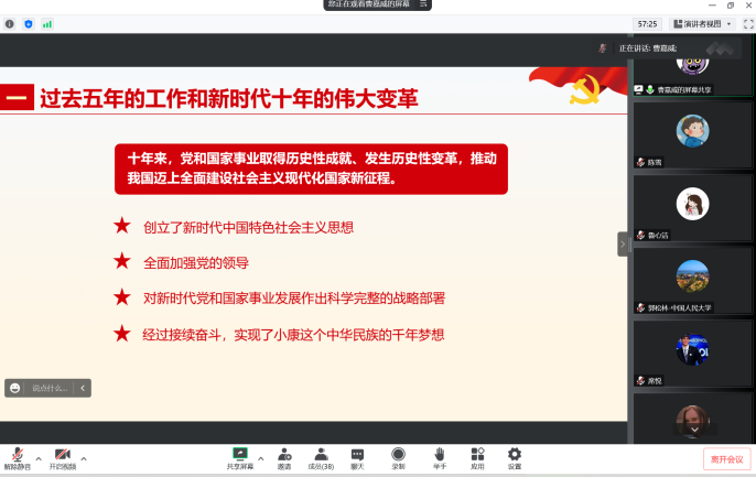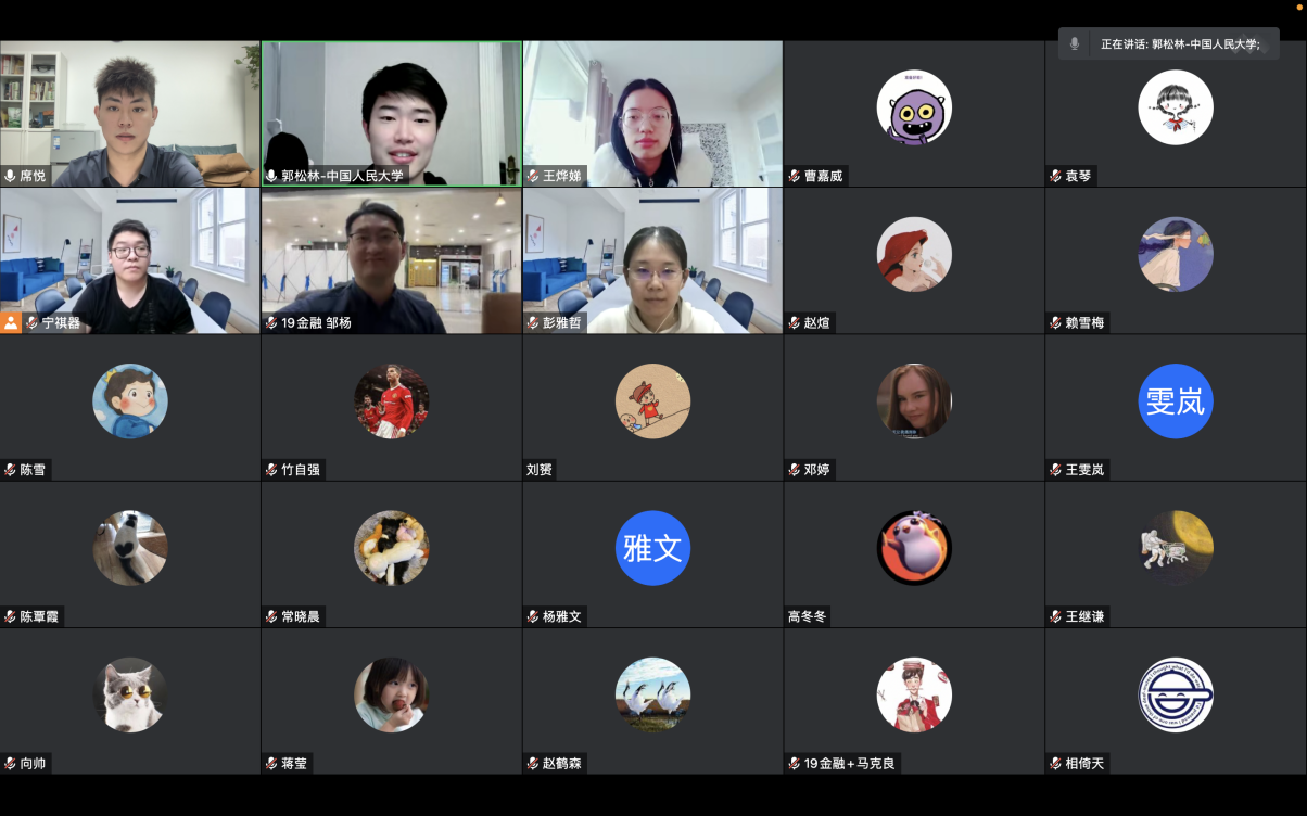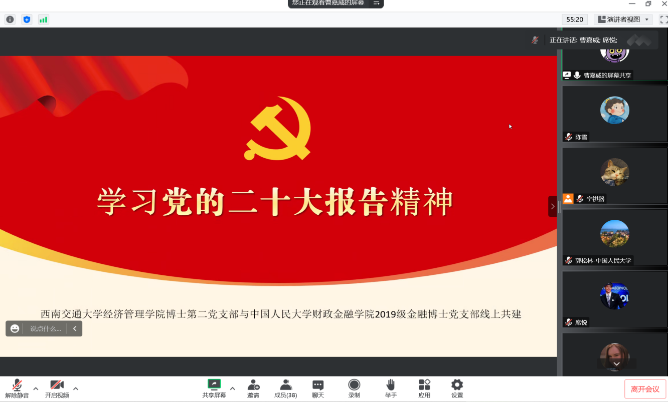 2022年11月9日晚上20:00,冰球突破豪华版官方网站博士第二党支部和中国人民大学财政金融学院2019级金融博士党支部共四十多名学生党员举行线上党支部共建主题党日活动,深入学习和领悟党的二十大精神。活动由冰球突破豪华版官方网站博士第二党支部的席悦同志和中国人民大学财政金融学院2019级金融博士党支部的郭松林同志共同主持,两个党支部的全体党员参加此次活动。