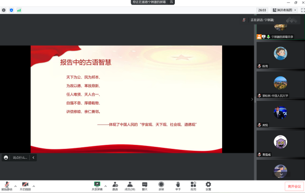 接着由中国人民大学财政金融学院2019级金融博士党支部的宁祺器同志,从三个方面带领大家学习和领悟了党的二十大报告。首先,宁祺器同志从“数”说二十大开始,为党员同志们详细介绍了党的二十大报告中的一些重要内容,其中包括:一个中心任务、第一要务、两个行、两步走、三个务必、三件大事、五项重大原则、五个“必由之路”和六个“必须坚持”。其次,结合报告中引用的一些经典名句,宁祺器同志深入讲解了中国人民的“宇宙观、天下观、社会观和道德观”。最后,宁祺器同志以习近平总书记对青年人的期盼收尾,号召学生党员应把党的二十大报告的学习与自己的学习生活实际紧密结合起来,坚定理想信念,筑牢精神之基,不负时代、不负韶华、不负党和人民的殷切期望。