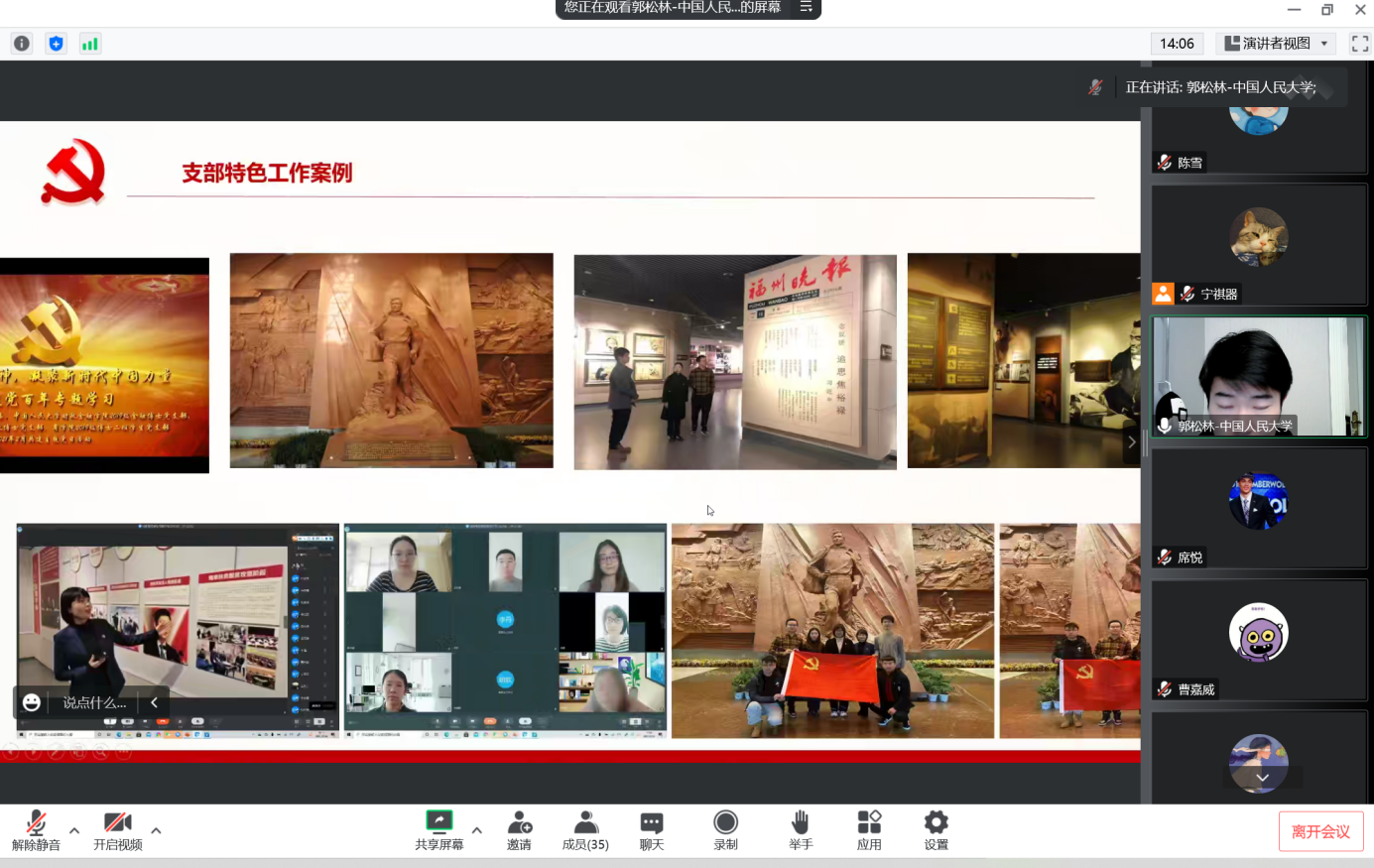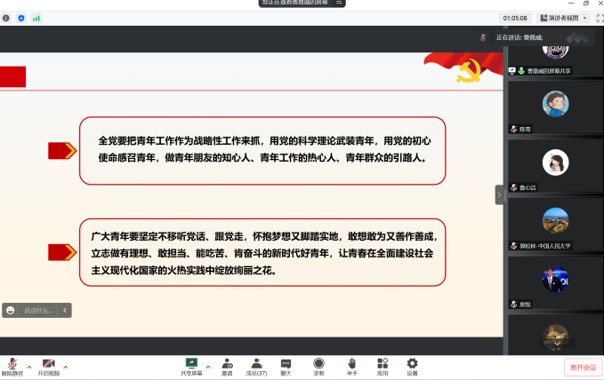 活动伊始,中国人民大学财政金融学院2019级金融博士党支部的郭松林同志表示,党的二十大是在全党全国各族人民迈上全面建设社会主义现代化国家新征程、向第二个百年奋斗目标进军的关键时刻召开的一次具有重大意义的大会。在此背景下两个党支部的跨校联合共建,共同学习领悟党的二十大精神和分享各自党支部建设的经验,也具有十分重要的现实意义。郭松林同志随后介绍了党支部的基本情况,其中包括党支部的特色工作、调研工作以及党支部同志的风采展示等。