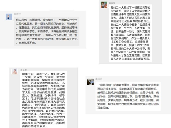 2022级EMBA临时党支部分成四个党小组进行分组学习,采取线下线上、自学领学、读报告听报告相结合的方式开展党的二十大精神学习和讨论。每位党员认真书写学习感受,为学习贯彻党的二十大精神奉上新答卷。党员同志们通过学习一致认为,时代赋予了我们重要的历史任务,使命光荣、责任重大,要把认真学习贯彻党的二十大精神作为义不容辞的政治责任,并坚持在学懂、弄通、做实上下功夫,从中掌握解决问题、推动工作的“金钥匙”。作为在职研究生,要在学院党委的带领下继续认真学习领会党的二十大精神,认真完成学业并积极在工作中实践;要胸怀赤诚、自信自强、全身心投入,不断提升自己、奉献自己,积极参与研究谋划各自推进中国式现代化建设的场景,进一步明确发展目标,制定行动计划,勇于攻坚突破,自觉成为党的二十大精神的学习者、宣传者和实践者,为中国式现代化事业贡献个人更多智慧和力量。