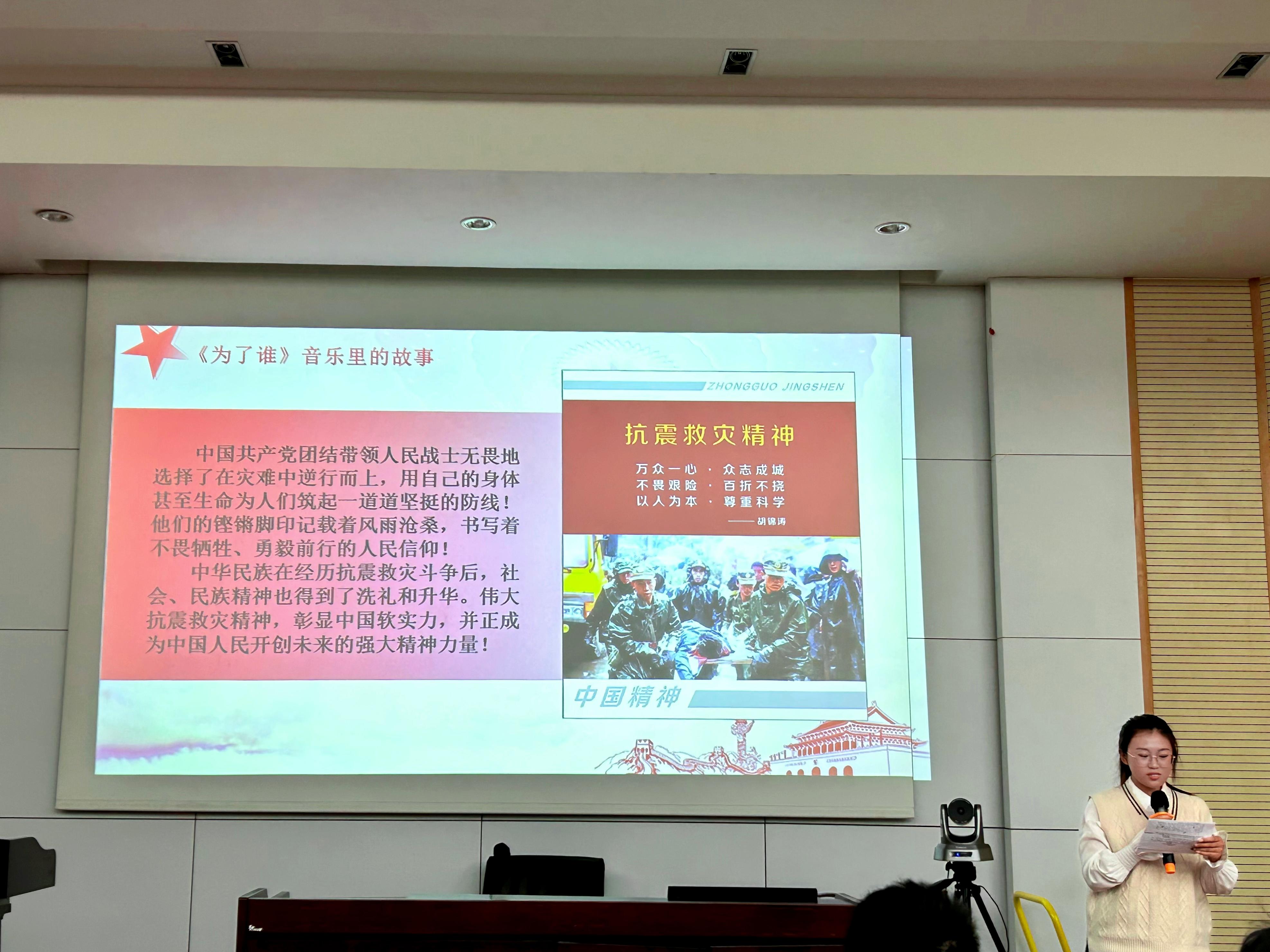 恰逢“5·12”汶川大地震15周年和第十五个全国防灾减灾日,为缅怀地震死难者、领悟抗震救灾精神,支部开展了“弘扬抗震救灾精神,感党恩跟党走”专题活动,邀请学校“音乐里的故事”《为了谁》讲演团为支部成员讲述了一堂动人的音乐思政课。讲演团通过演讲、演唱等方式,带领支部成员重温抗震救灾的感人故事,为支部成员生动诠释了中国共产党在面临大灾大难考验时,万众一心、众志成城、不畏艰险、百折不挠、以人为本、尊重科学的抗震救灾精神。艺术表演和思想教育相结合,引导党员同志在中国共产党的领导下,改革创新、锐意进取,大力弘扬伟大抗震救灾精神,在实现中华民族伟大复兴的新征程中奋勇前行。
