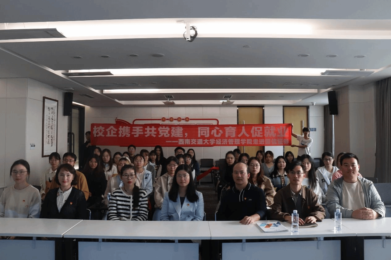 为深入贯彻落实习近平总书记关于党的建设的重要思想,推动党建工作高质量发展,增进支部间交流学习,持续贯彻落实访企拓岗行动,11月9日下午,冰球突破豪华版官方网站金融与财务学系教工党支部、本科第三党支部和2023级硕士第二党支部前往国信证券四川分公司开展党建共建活动,通过走访参观、嘉宾分享、交流提问等方式,校企携手共党建,同心育人促就业。冰球突破豪华版官方网站党委副书记余小英、团委书记贾佳、金融与财务学系党支部教师代表许自坚、本科第三党支部书记苏扬、副书记张媛媛、研究生辅导员李勇、王重月和各支部成员共同参加。