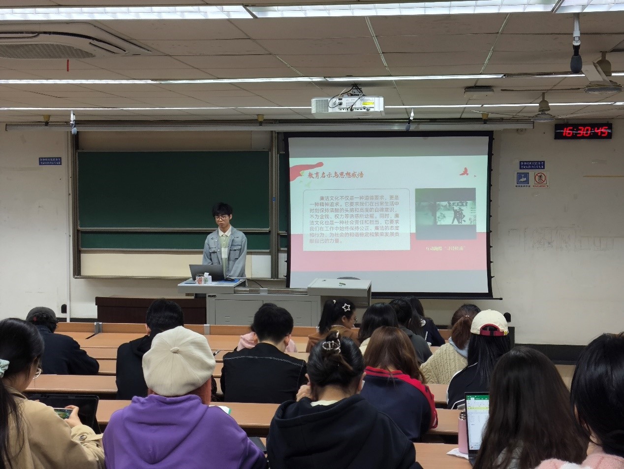 第二部分,王佳轩带领支部成员一起观看了支部原创的党纪学习教育主题视频。视频主要围绕着支部前往成都廉洁动漫基地进行党纪学习教育展开,不仅呈现了基地的历史、270°沉浸式廉洁宣传片,以及同学们参与活动等现场内容,还包含了支部成员对于党纪学习教育学习的理解。视频不仅让参与活动的同学们对党的廉洁纪律有了更深刻的认识,也让未参与活动的同学们了解到了相关内容。