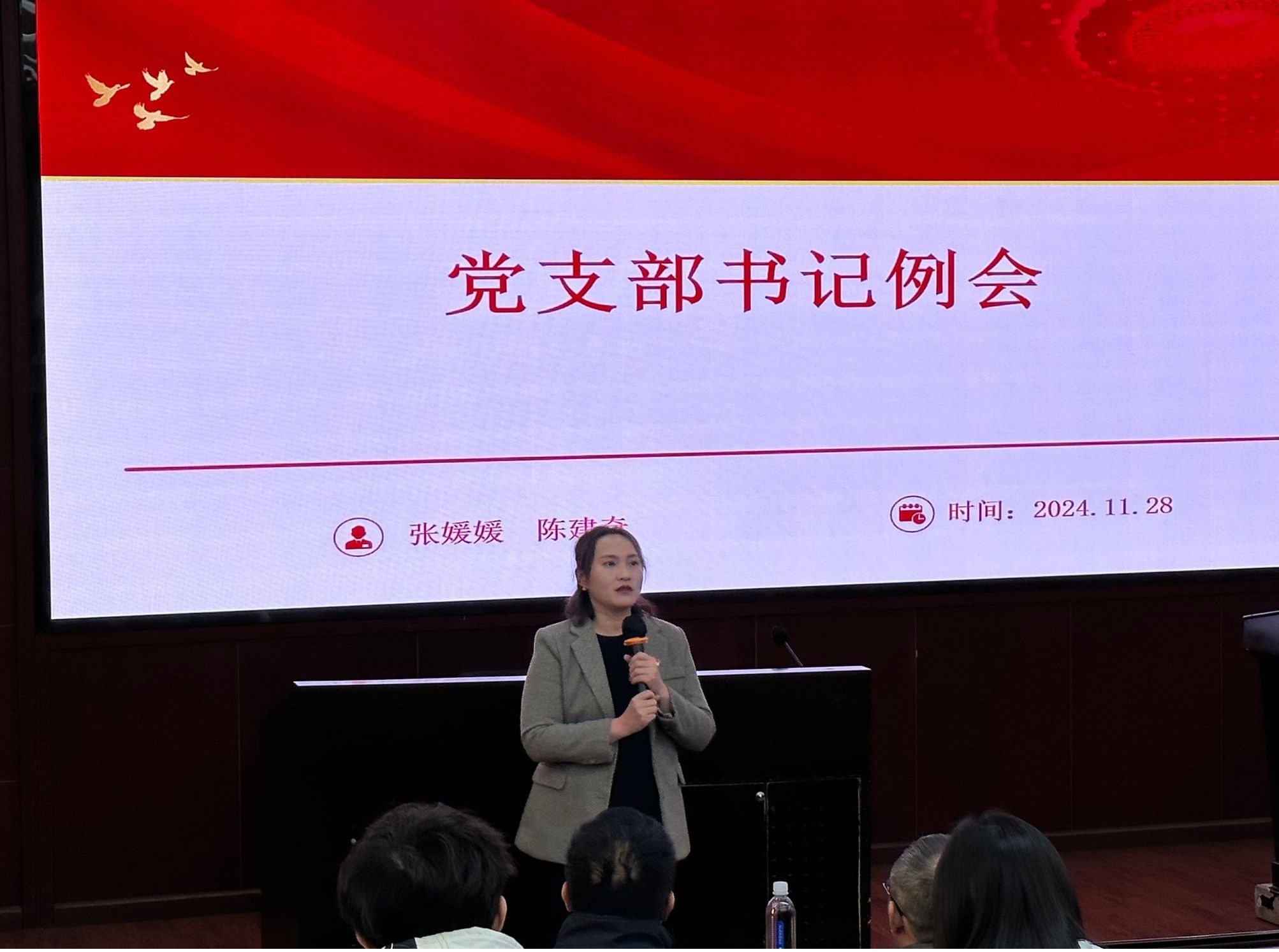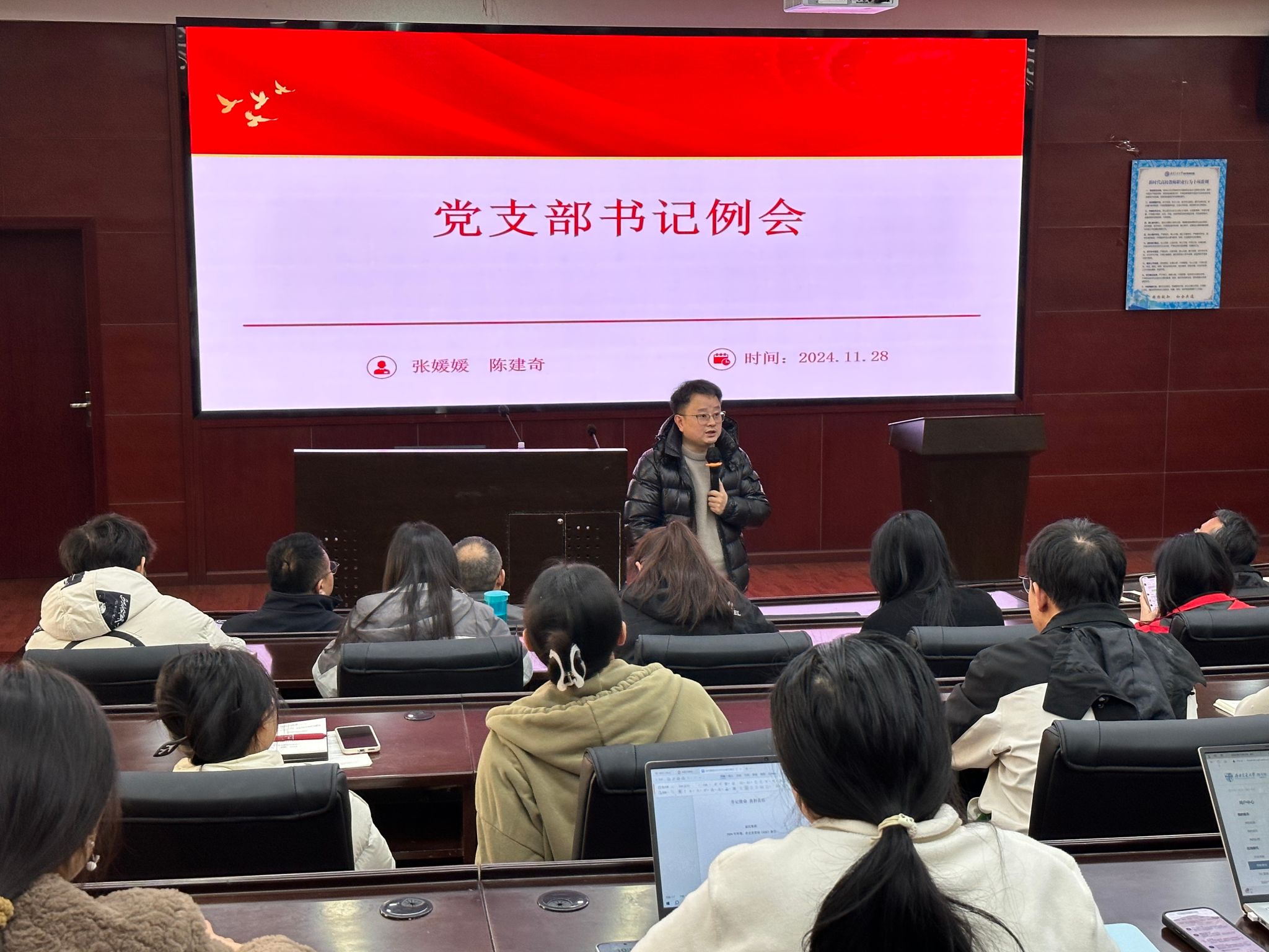 20241128日,学院党委在0228教室召开党支部书记工作例会,学院党委书记郭强、副书记晏理斌、党委组织员以及师生党支部书记30余人参加了会议。会议由组织员张媛媛主持。会议布置了近期党支部工作,并就主题党日活动的开展、党支部工作的总结、党支部转入转出党员的清理等进行了交流讨论。会议指出,党支部主题党日制度是党的组织生活中重要的一项制度,是党员与党组织之间密切联系的纽带, 各党支部要明确主题党日活动主题,确保每次活动有实质内容、有实际效果。会议同时强调了梳理党支部党员组织关系和党员基本信息的严肃性、重要性,提醒党支部做好年度总结工作。